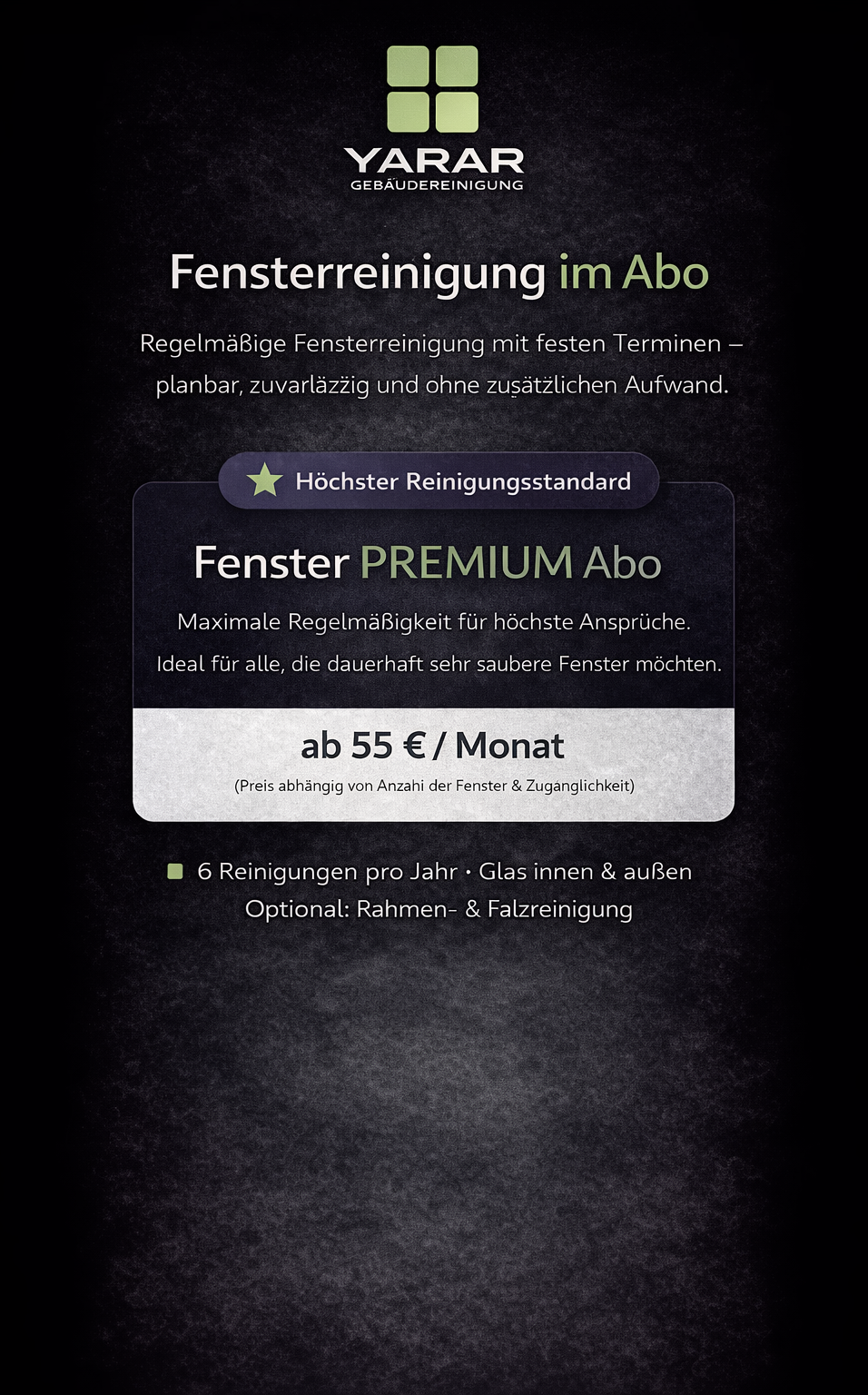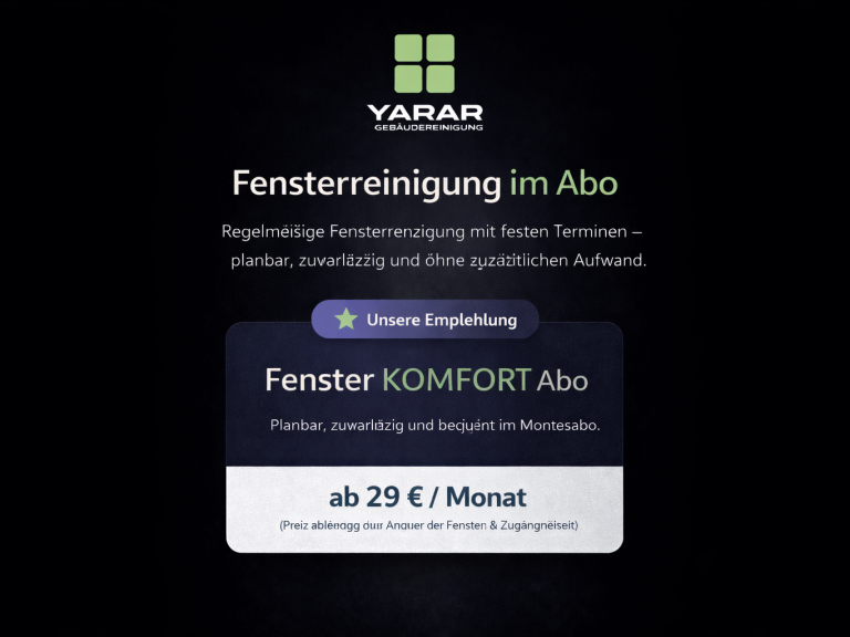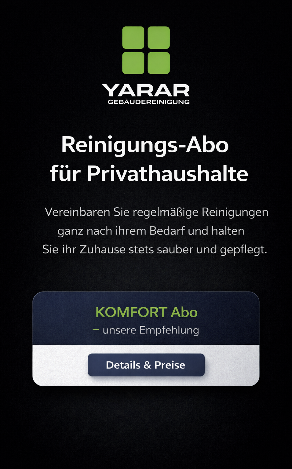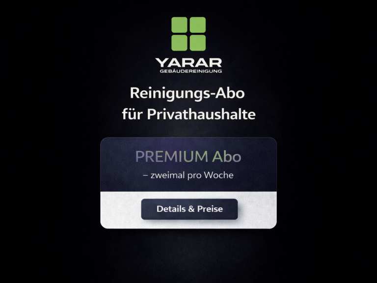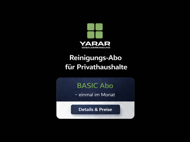 Mit einem Reinigungs-Abo bei YARAR Gebäudereinigung übernehmen wir die regelmäßige Reinigung zuverlässig und planbar – damit Sie sich um nichts mehr kümmern müssen.