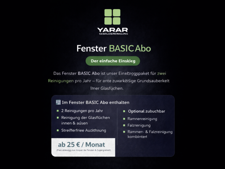 Durch feste Abläufe und planbare Termine bleibt der organisatorische Aufwand für Sie minimal. Sie wissen genau, wann gereinigt wird, und können sich jederzeit auf eine zuverlässige, streifenfreie Ausführung verlassen. Dieses Abo eignet sich besonders für Haushalte, die Wert auf Sauberkeit, Ordnung und ein professionelles Erscheinungsbild legen.